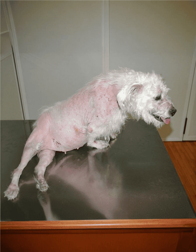 Hypothyroidism occurs when a dog’s thyroid gland doesn’t produce enough hormones. This condition is common in middle-aged and older dogs. Skin symptoms include thinning fur, dry coat, and flaky skin. They might also have hair loss, especially on their trunk and tail.