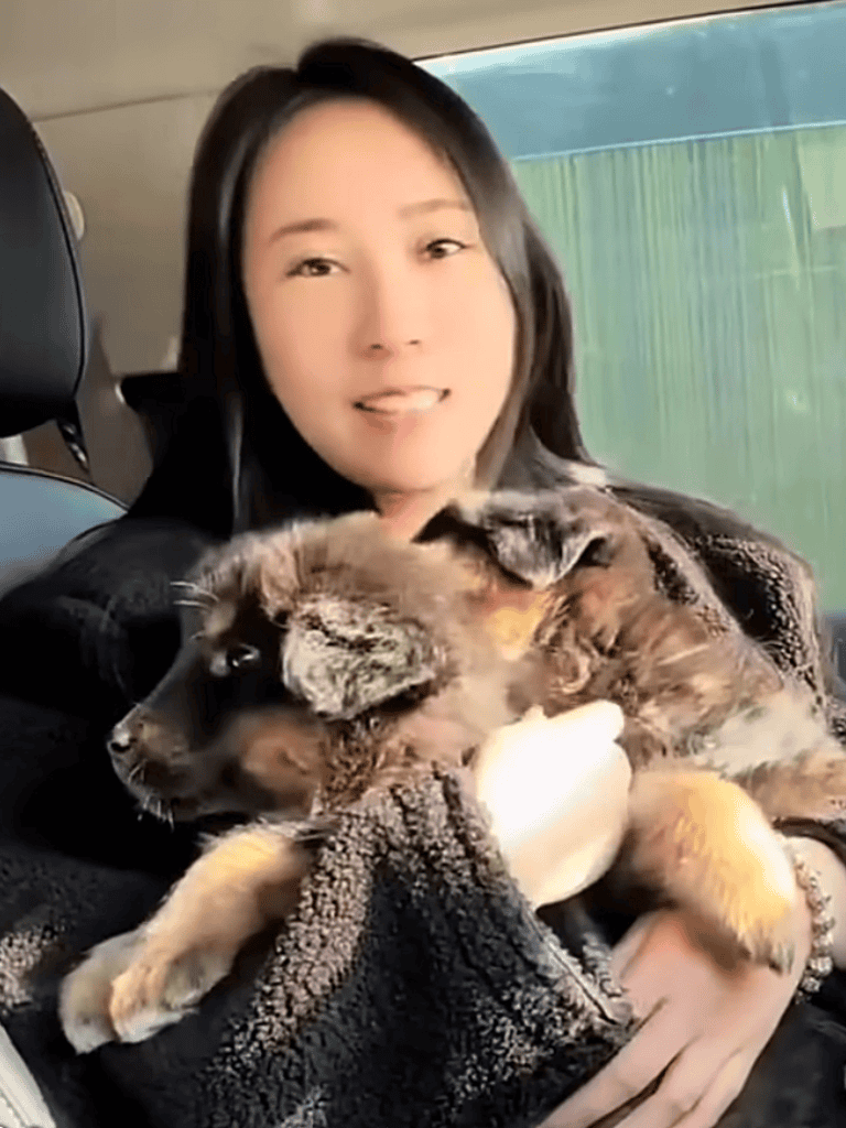 The injured puppy gazed up at her with eyes full of tears, instantly tugging at her heartstrings. Without a second thought, she gently gathered them up and nestled them safely in her car.