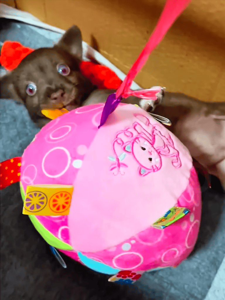 On Day 50, I gave Tanzi a new toy—a bouncy ball. She grabbed it eagerly, pounced, gnawed, and wagged her tail, showing her attachment to the toy and our bond.