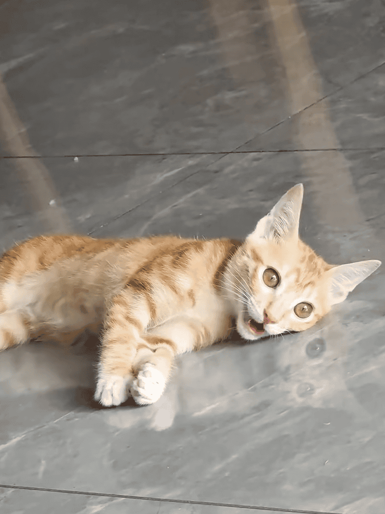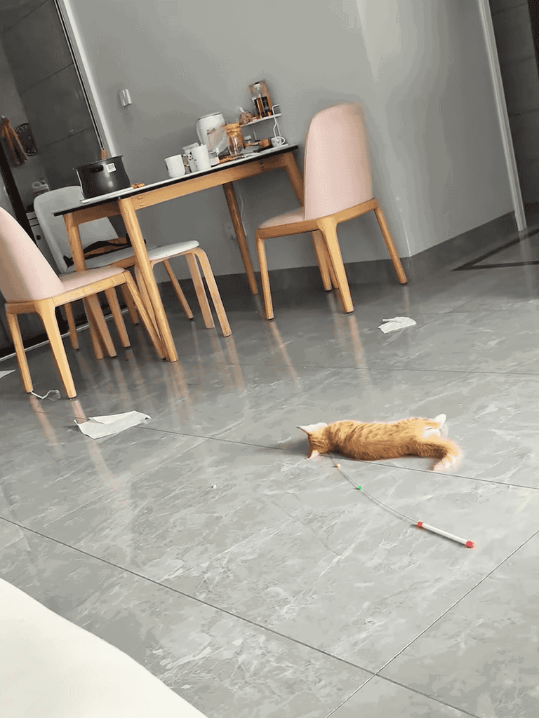 Today, we caught a tiny insect for her. She crouched low, tail swishing, focused on her new toy. She tapped it cautiously, then pounced. After that, she darted around with clumsy energy, filling the room with joy.
