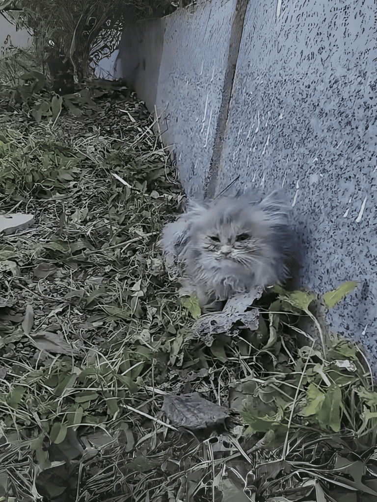 By the roadside, a tiny kitten shivered, soaked and grimy, letting out faint cries above the passing traffic.