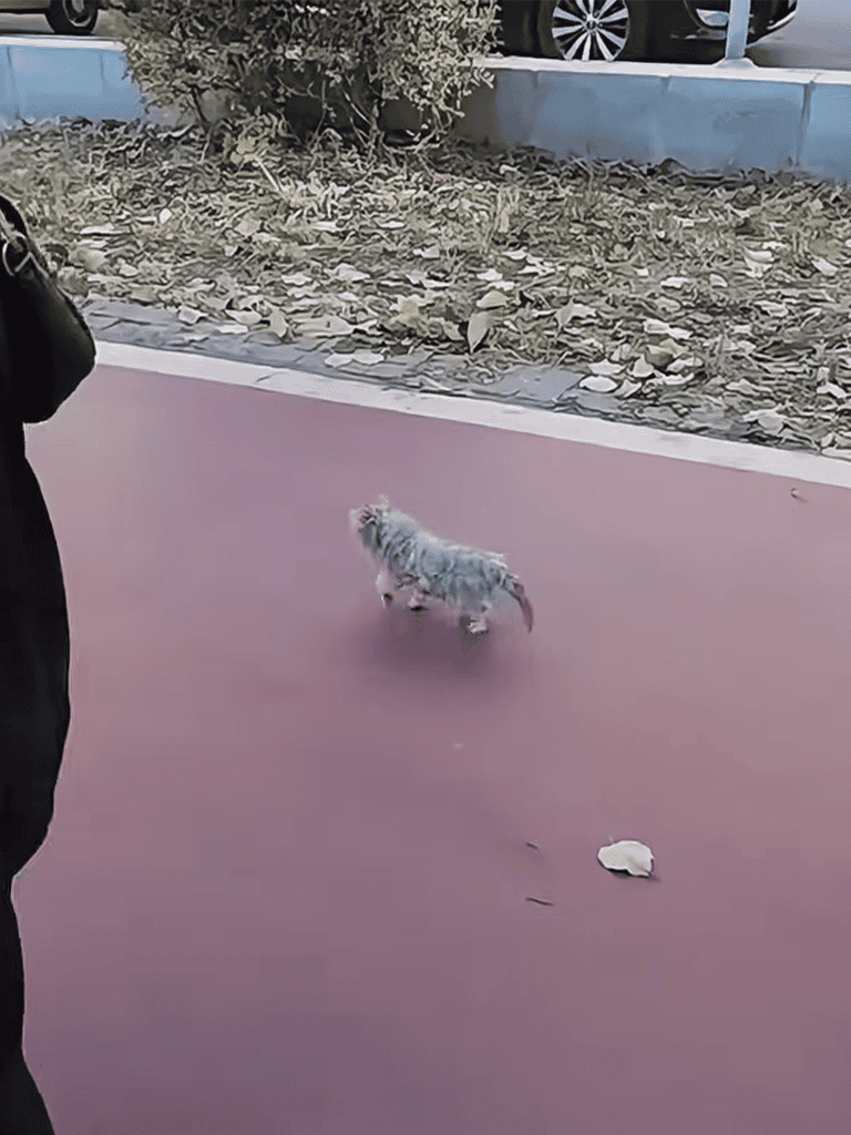 The ground was slick under the faint morning light. The kitten’s wet fur clung to its bony frame, leaving tiny wet footprints marking its path.