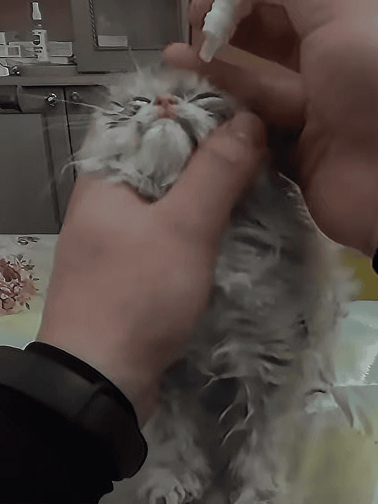 I picked him up to clean his eyes, used a wet wipe to clear the stains, and applied the prescribed eye drops.