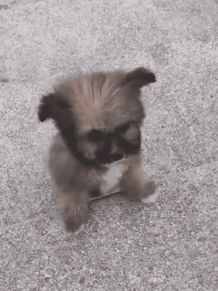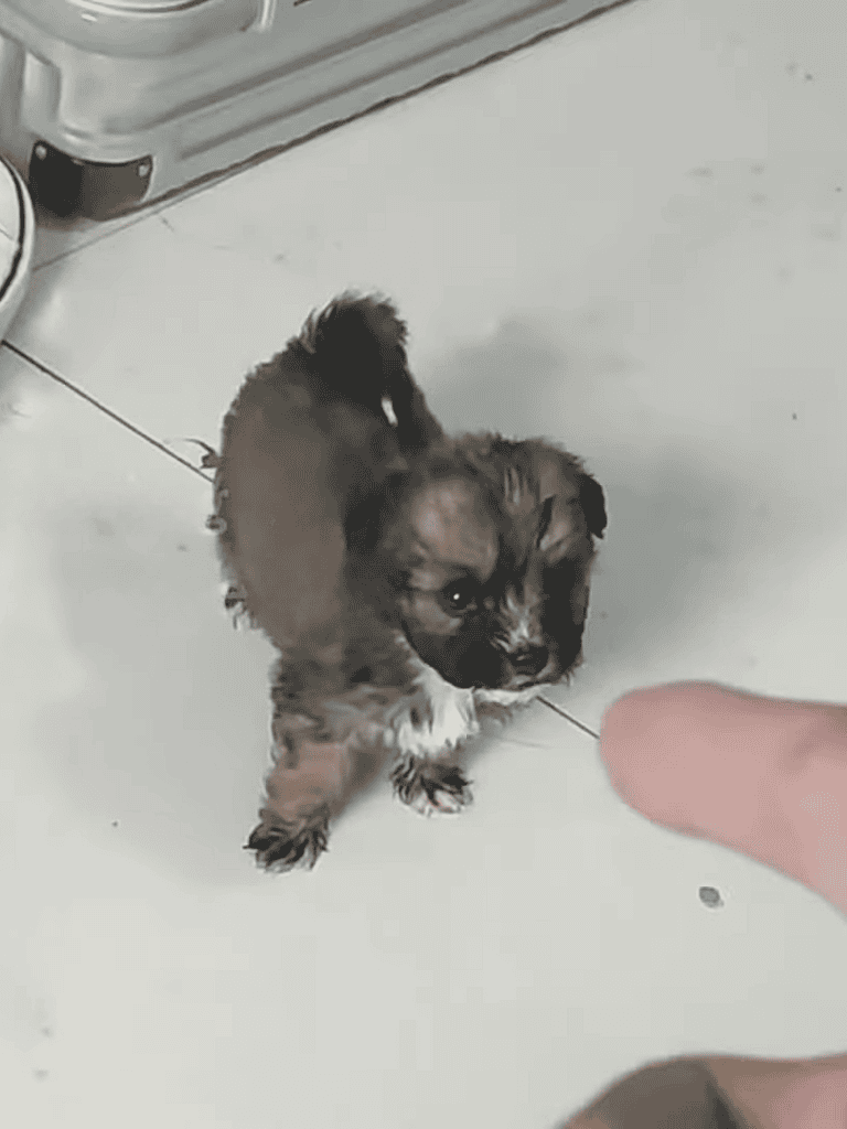 The tiny puppy wobbled with each step, its legs too weak to support its body. It flinched at sudden movements and cried when pointed at. Despite trembling, it kept going.