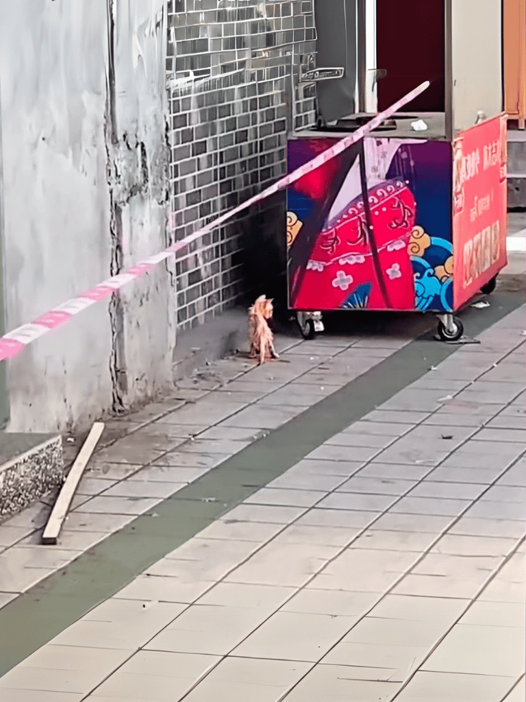 A scruffy stray cat, its fur matted and sticky, stumbled to a passerby, silently begging for food.