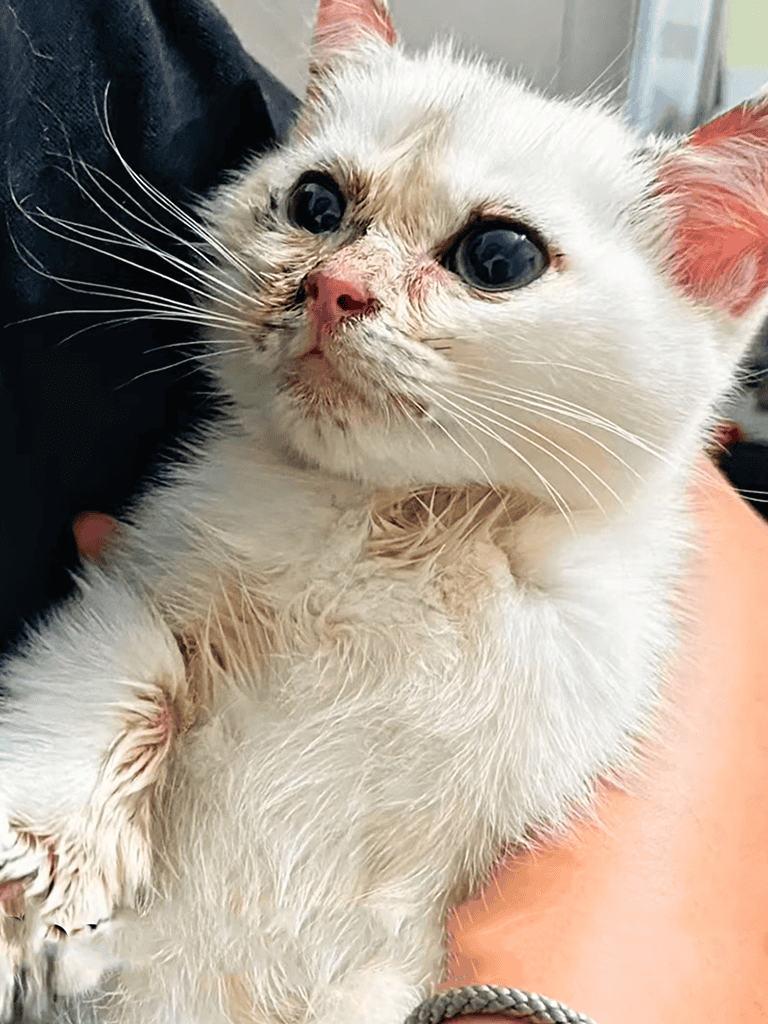 One eye was sealed shut, a crust masking the cat’s gaze. His face reflected hardship and a plea for care.