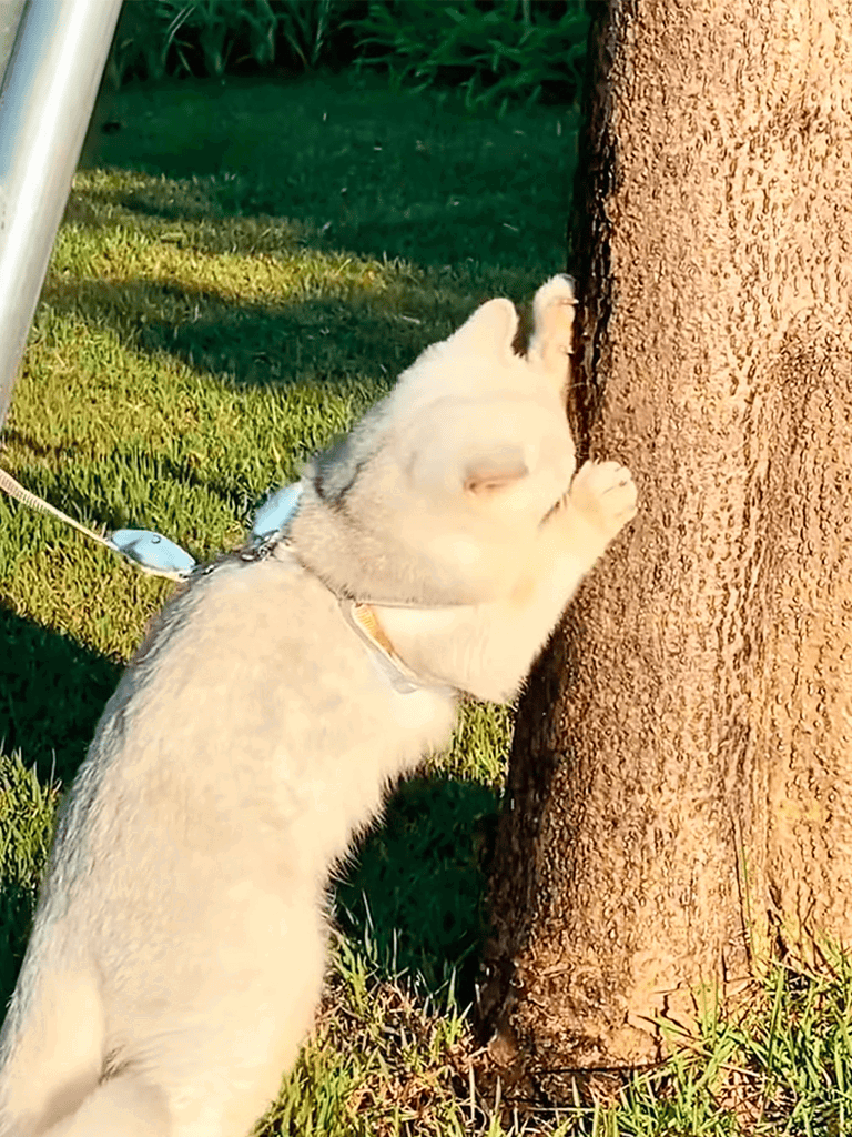 On the lawn, his whiskers twitched as he observed leaves and birds. At the beach, he explored the sand and watched waves.