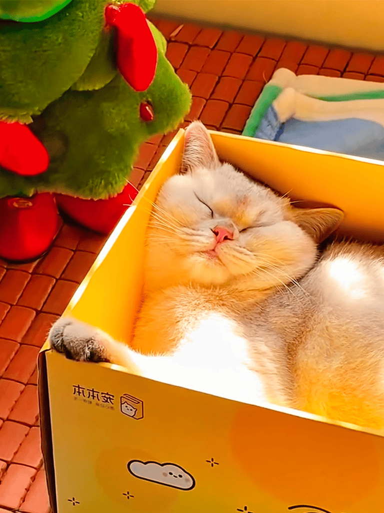 Day sixty-nine: Lazai enjoys curling up in boxes, warmed by sunlight streaming through the window, finding comfort and tranquility.