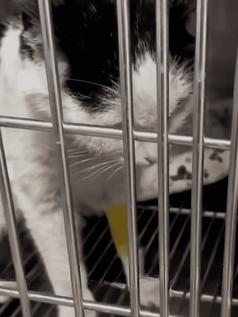 The girl arrived at the hospital and knelt by the cage, relieved to see the cat sitting upright with a spark of life in its eyes. She gently spoke to the resilient feline, celebrating this small but significant victory.