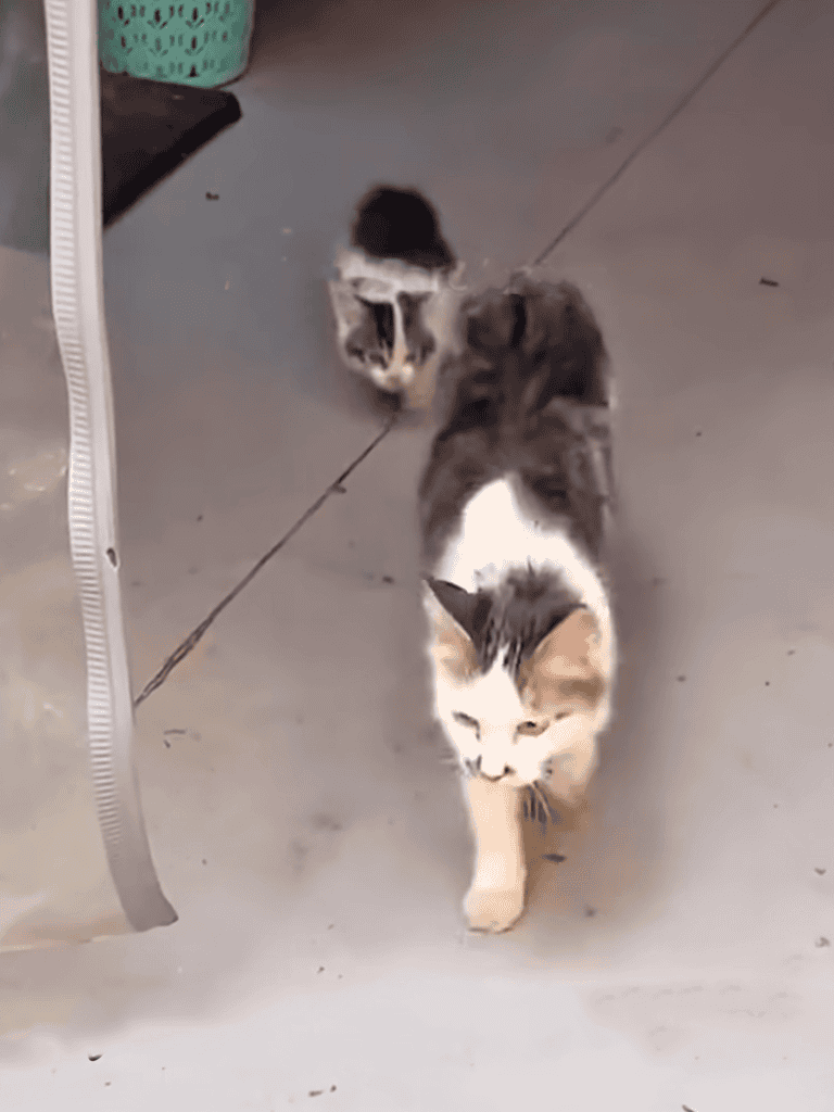 Older than the newborn she brought inside, they moved with playful energy. Watching them trot after her, tails high, I smiled—Baka had her paws full.