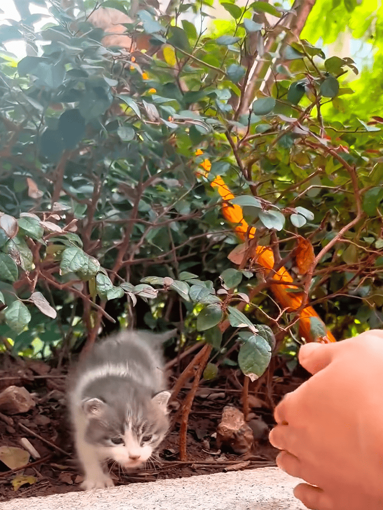 I spotted the kitten nestled in the bushes where Little Baka had hidden her. The mother cat had wandered off, unconcerned.
