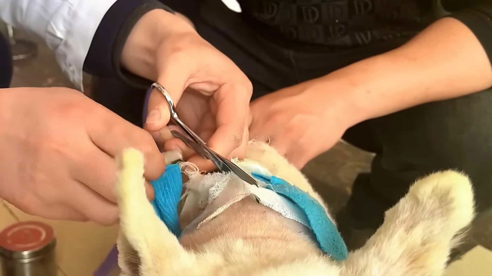 With utmost care, they soothed him and uncovered a grim reality: his body bore severe wounds, including a festering injury on his neck and deep cuts that revealed his harrowing neglect.