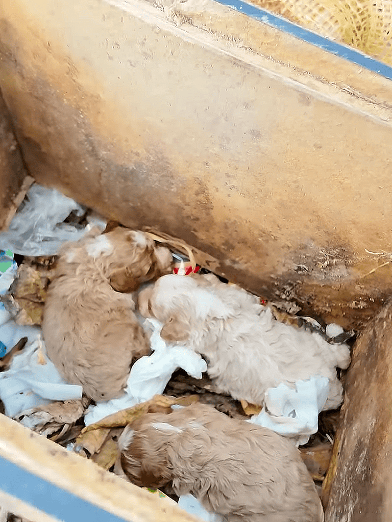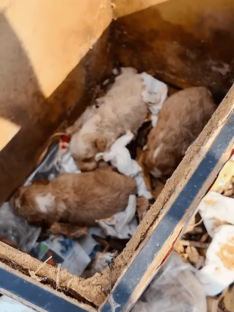 Amid the garbage, a brown mother dog lay on a worn foam box, her fur matted. Beside her, in a makeshift container, was a litter of puppies, their damp fur clinging to fragile frames, huddled together for warmth.
