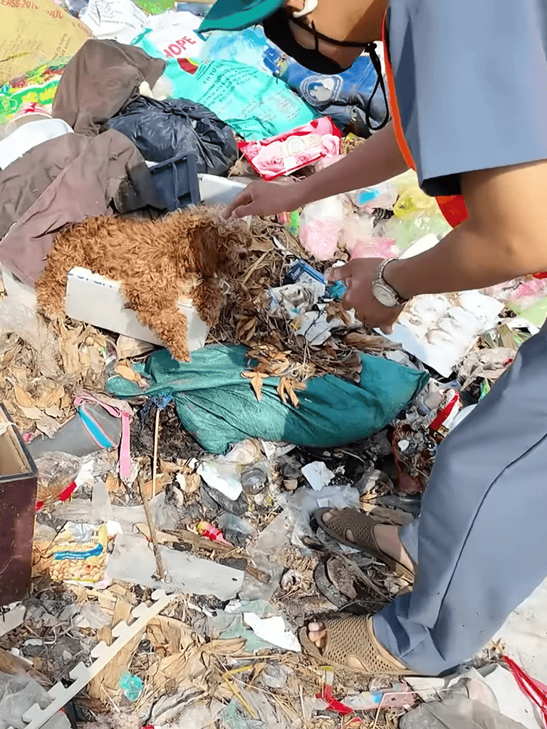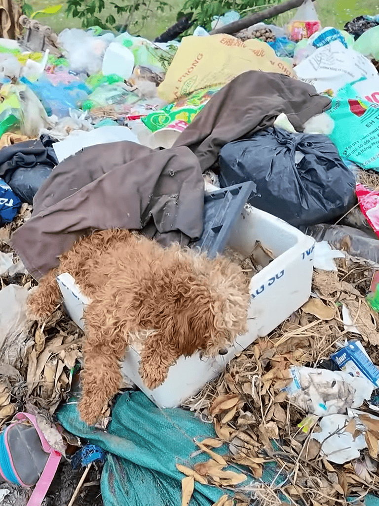 Beneath the sun in a desolate stretch of garbage, a weary brown dog lay over a foam box. Inside a trash-filled container beside her were her litter of puppies, barely visible beneath the grime. This was where their struggle began.