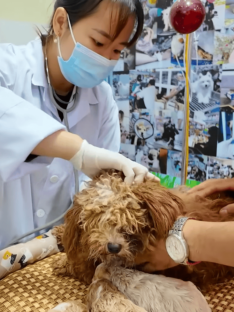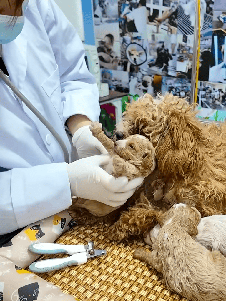 The mother dog, malnourished and neglected, was examined by the veterinarian. Her health was assessed—fever, matted coat, dirt-encrusted claws. Treatment began immediately. The doctor’s calm hands moved gently, offering rare tenderness.