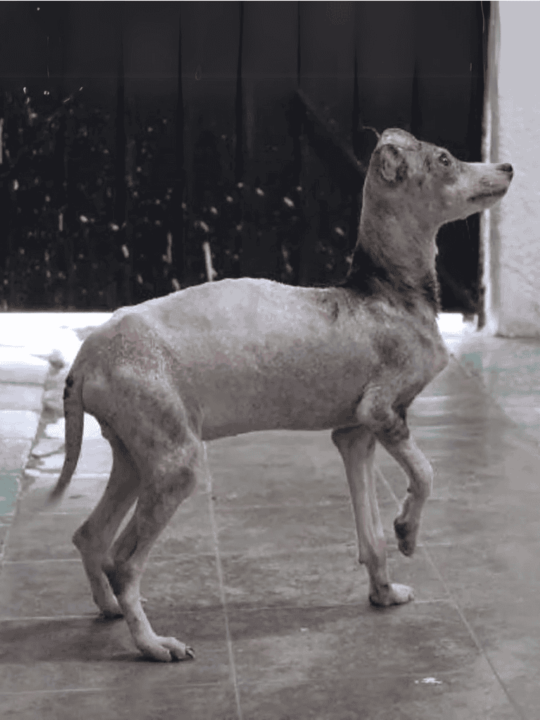 The dog’s tiny body showed his suffering. His raw, bleeding skin bore burns, and his ribs jutted out. He was malnourished, weak from starvation and dehydration.
