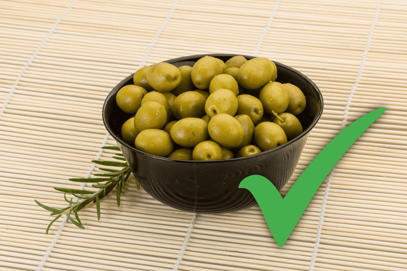 Green olives? Yes, they can! As always, however, moderation matters – and make sure they are pitted.