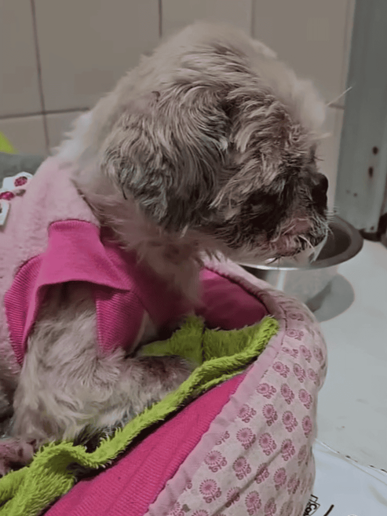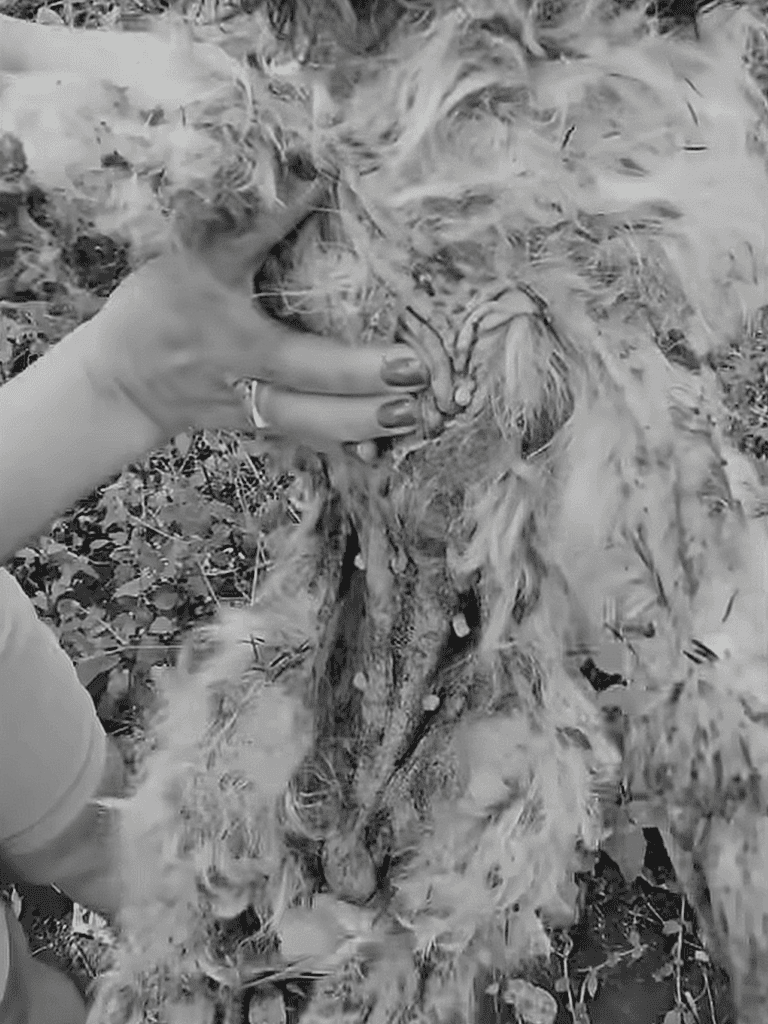 Found in a heartbreaking state—her skin decaying, maggot-infested wounds, and filthy fur—she was barely alive. Rescuers removed the maggots, offered food and water, and trimmed her fur as she rested, calm despite her pain.