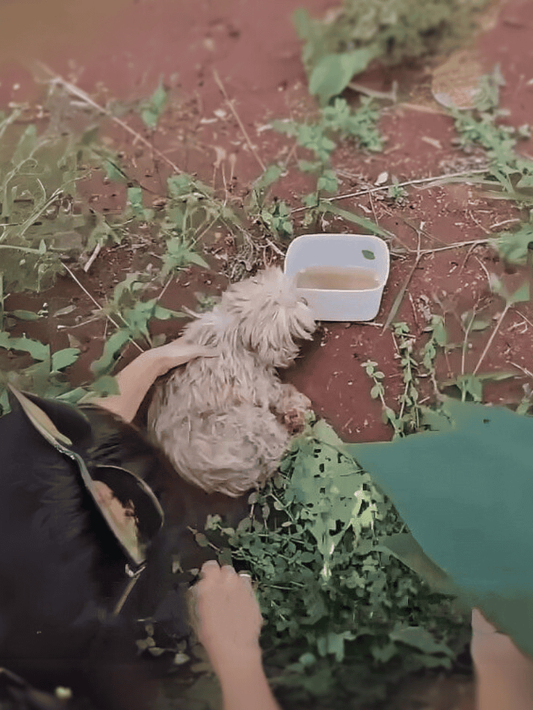 Hidden in the forest, rescuers found a dog with decaying skin and maggots, lying still as if sensing their help. They cleared the infestation, offered food and water, and transported her for care. A vet confirmed she had been abandoned as a breeding dog, left to die.