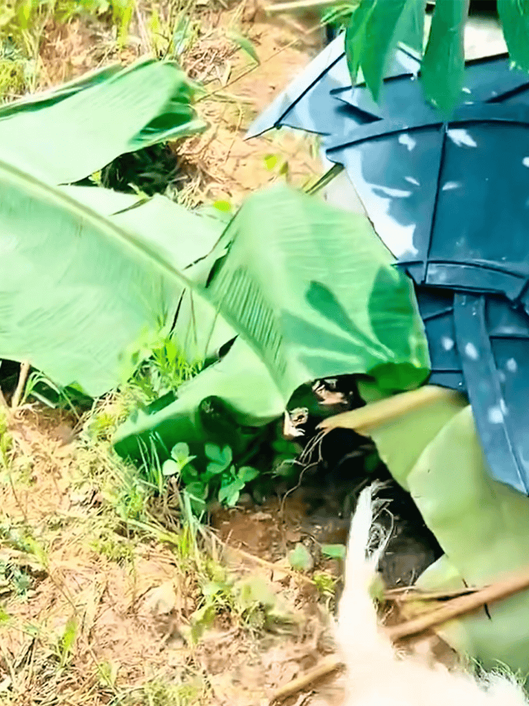 The den was complete. We covered it with banana leaves to keep it hidden and safe. The mother dog wagged her tail slightly, as if approving. We hoped it would keep them warm and secure.