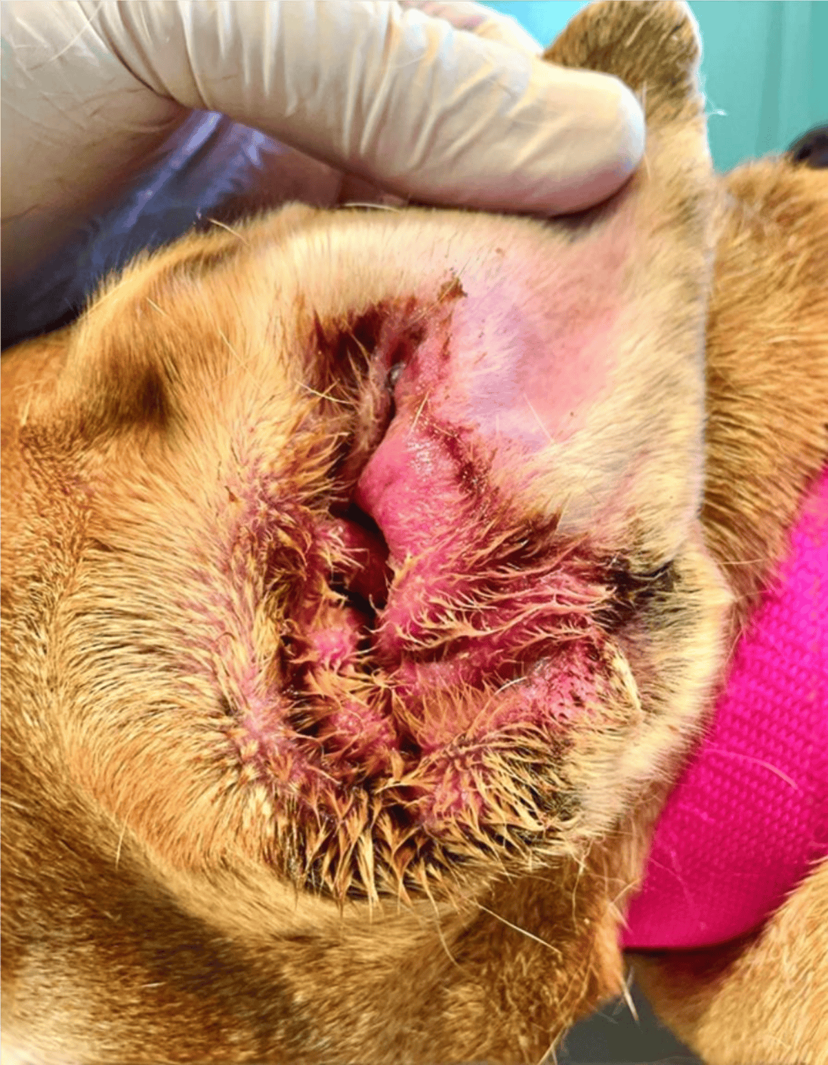 Conditions such as pemphigus or lupus can play a role. Pemphigus foliaceus typically causes hair loss, scabs, and ulcers (open sores) around the head, face, and ears.