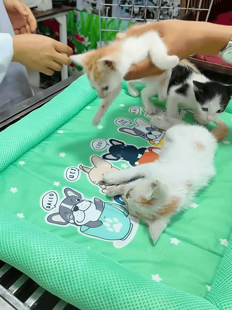 We placed the kittens on a foam board. This makeshift station became their lifeline as we assessed their fragile conditions and prepared for the next steps.