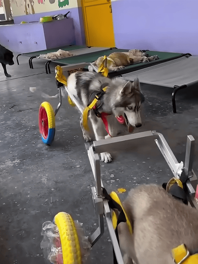 With a custom wheelchair, Volga moved freely again. After much pain, he explored with curiosity. He also played with Sky, his tail wagging. He felt like a real dog again.