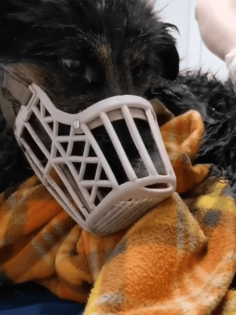 To prevent harm, we secured a muzzle, whispering reassurances. His eyes darted, but gradually his breathing steadied.