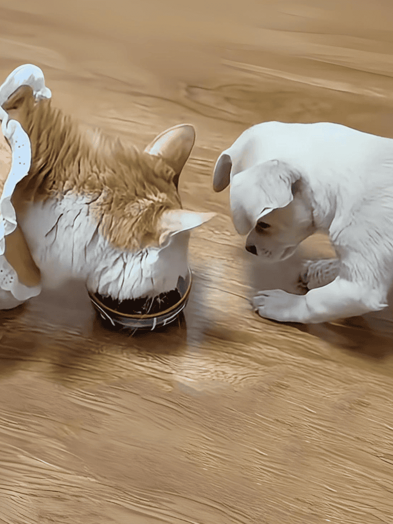 The daily rivalry between the dog and cat unfolded for the couple to witness. The cat would devour the puppy’s food, leaving the dog frustrated.