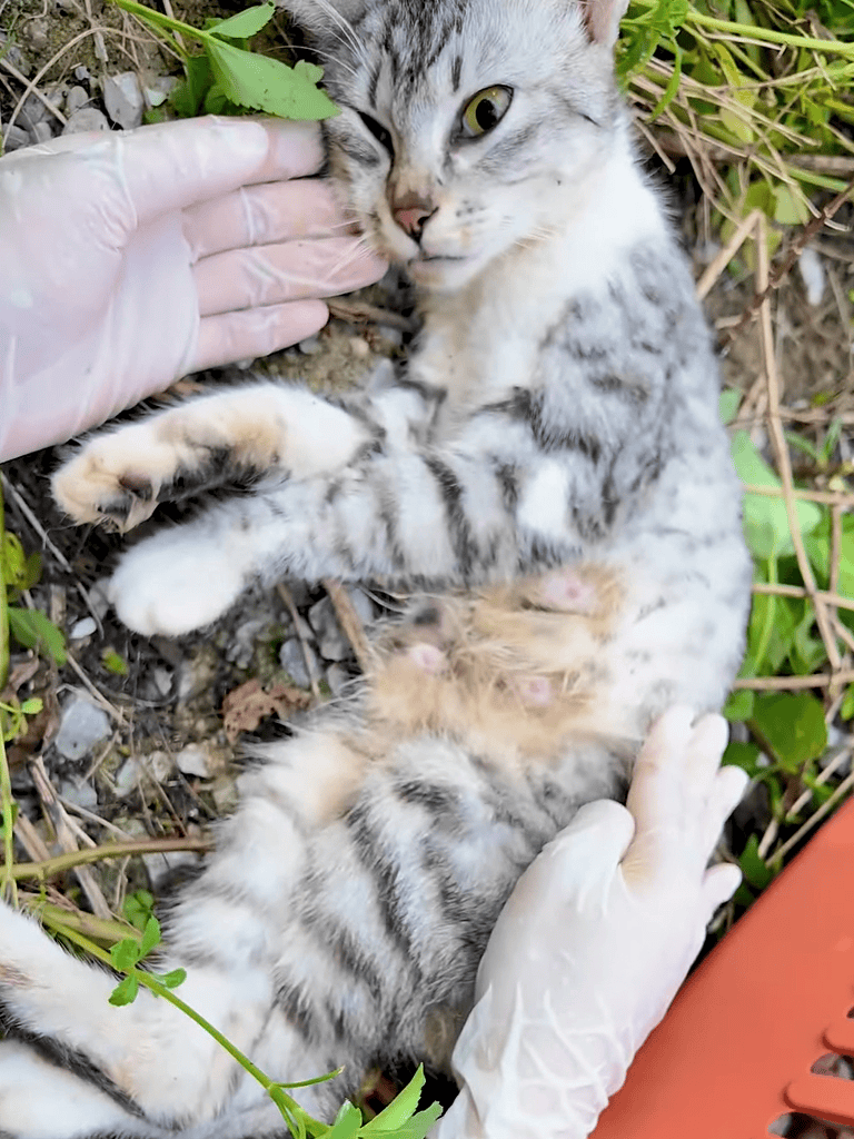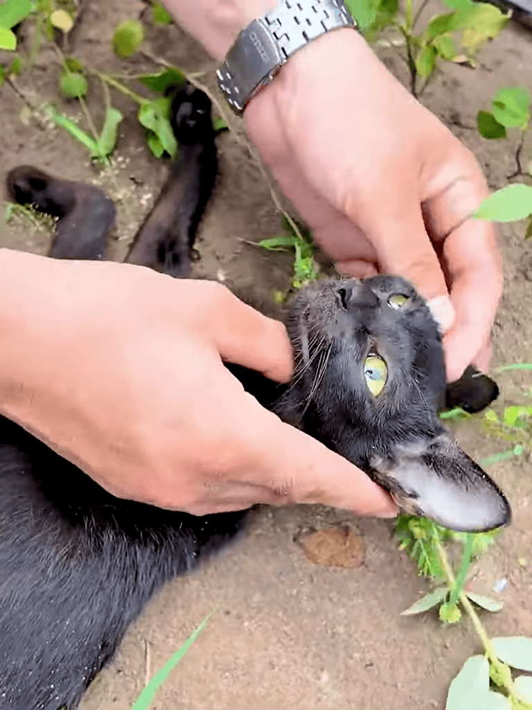 A team member knelt beside the frail mother cat, leaning in to catch the faint rhythm of her heartbeat. Her condition was evident, her breath shallow and body still.