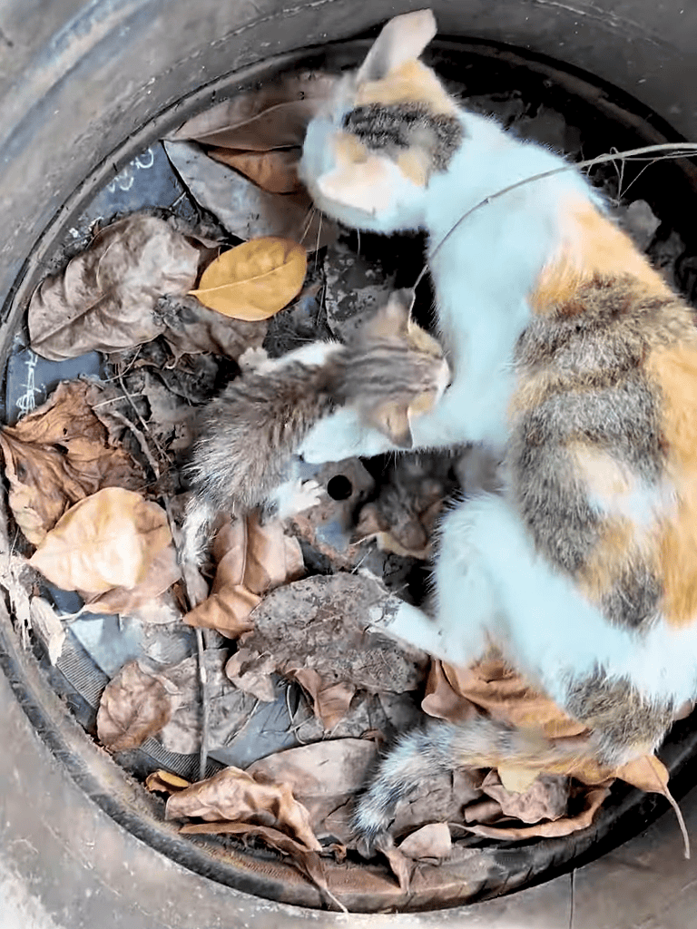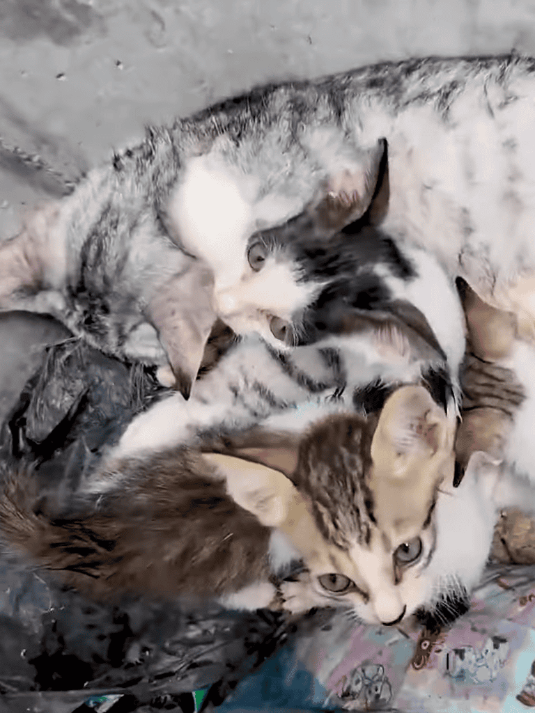 The mother cat’s eyes opened as her body stirred. Weak but steady, she meowed softly. Her kittens moved closer sensing her return. Fragile, she nudged each kitten, conveying comfort and reassurance.