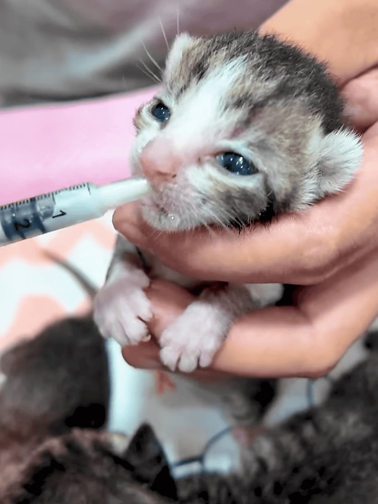 While the mother cat received treatment, the kittens were fed milk. Hungry and vulnerable, they drank quickly, reflecting their difficult journey.