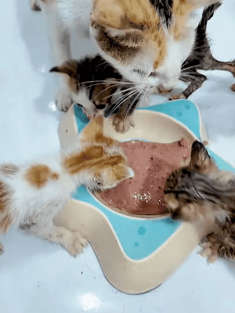 The mother cat sat, her eyes on the plate of food. Her frail body showed her ordeal, but she leaned forward, hungry. The kittens, wobbly on tiny paws, sniffed and began eating. Their soft eating sounds broke the earlier silence, sharing a meal and a moment of hope.