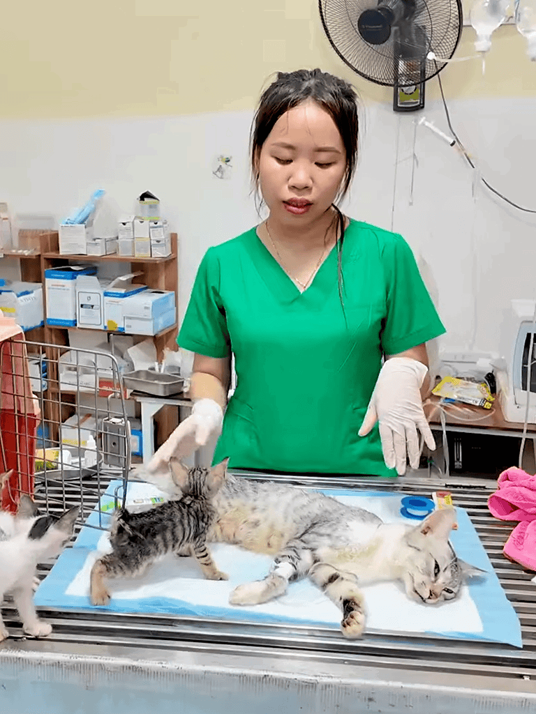 The mother cat lay trembling on the table as the veterinary team began. A nurse listened to her faint heartbeat, while another checked her temperature. Urgent treatment was necessary for her recovery.