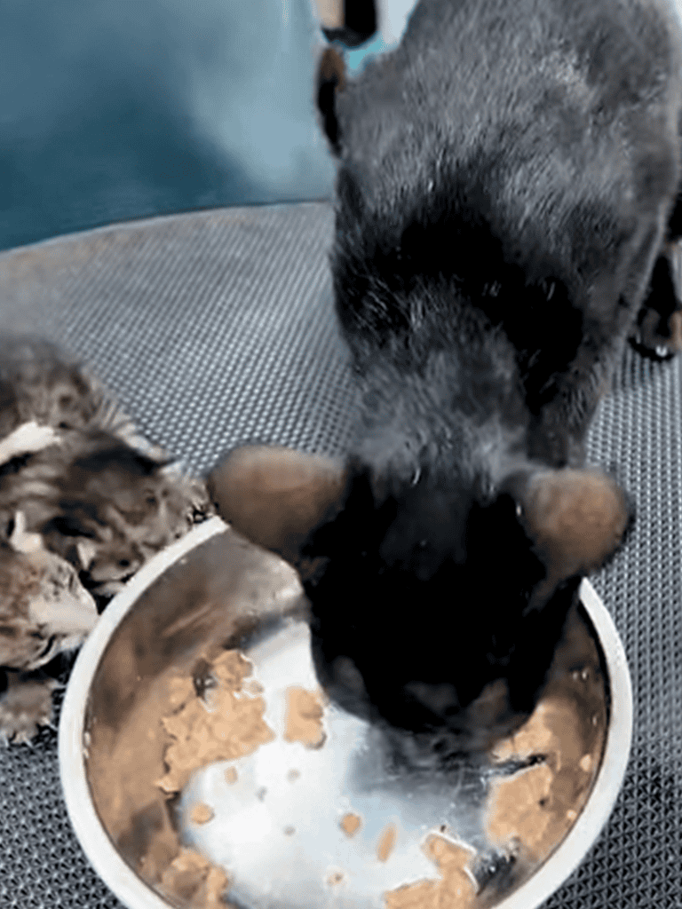 The mother cat, weary from the ordeal, ate urgently to regain strength, her body needing energy to nurse her kittens. As the kittens nestled contentedly, she continued eating with quiet resolve.