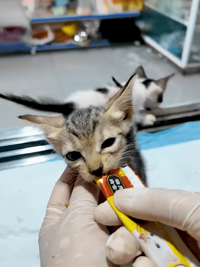 The doctor fed the kittens small amounts of food, ensuring each ate enough. Their fragile bodies showed hunger as they eagerly competed for each morsel, a step toward recovery.