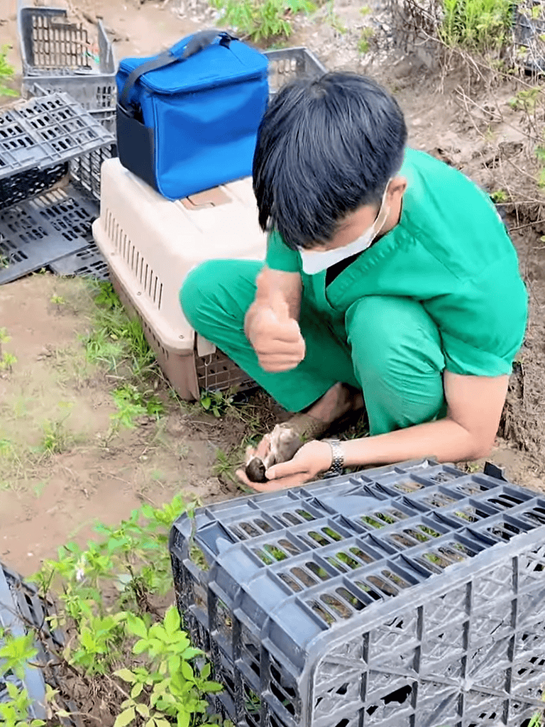 The doctor crouched by the hole, lifting the frail mother cat. She was limp and unsteady, unlike the kittens already in their cage. He examined her, noting something was wrong. Gently, he placed her in a cage for urgent medical attention.