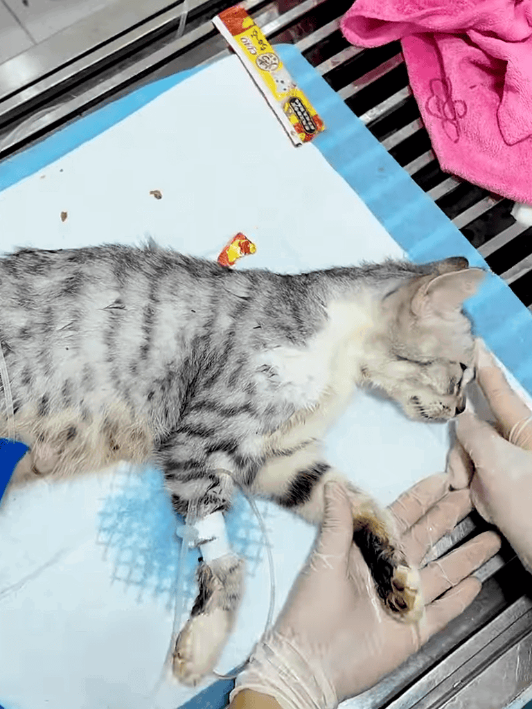 The veterinary team worked to revive the mother cat, applying oxygen and giving water to stabilize her condition as she began to show signs of recovery.