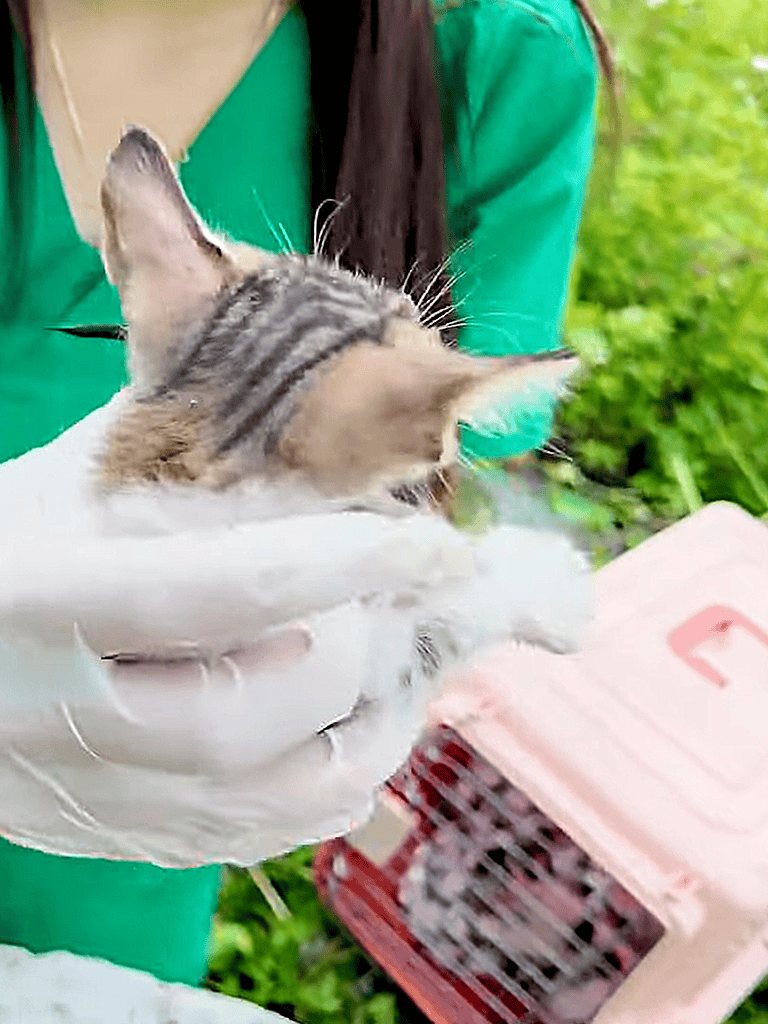 The doctor carefully coaxed the kitten from the hole and placed it in the rescue cage. It blinked in the light, beginning a new chapter for its family.