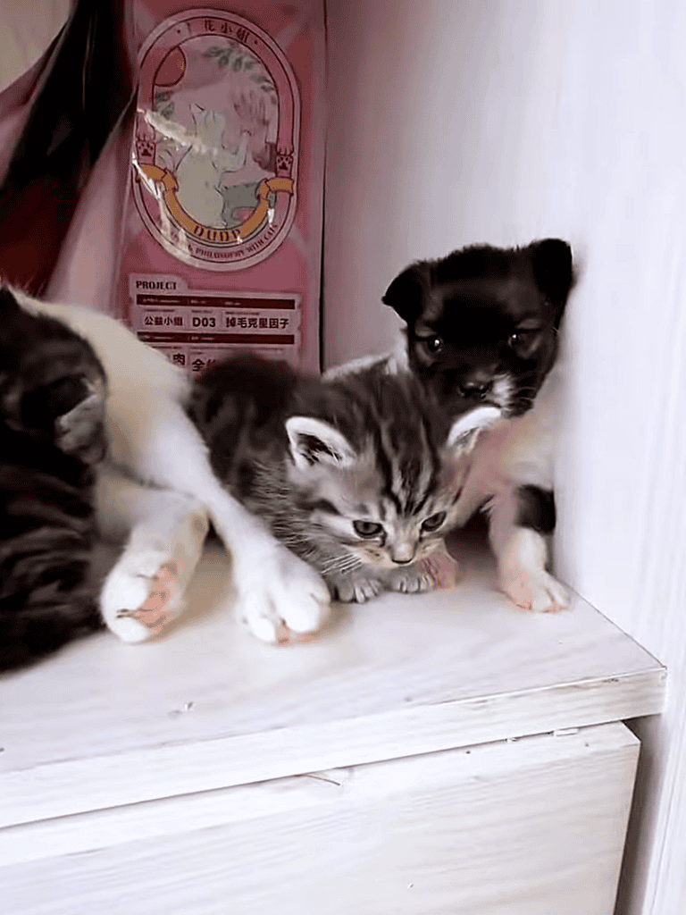 Their attention allowed the pup to flourish. She admired the warmth and kindness from the mother cat and kittens, who embraced the newcomer, ensuring it thrived.