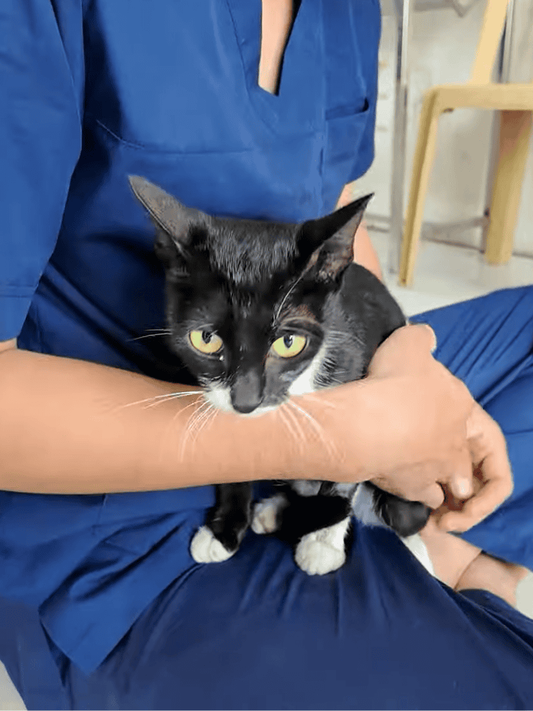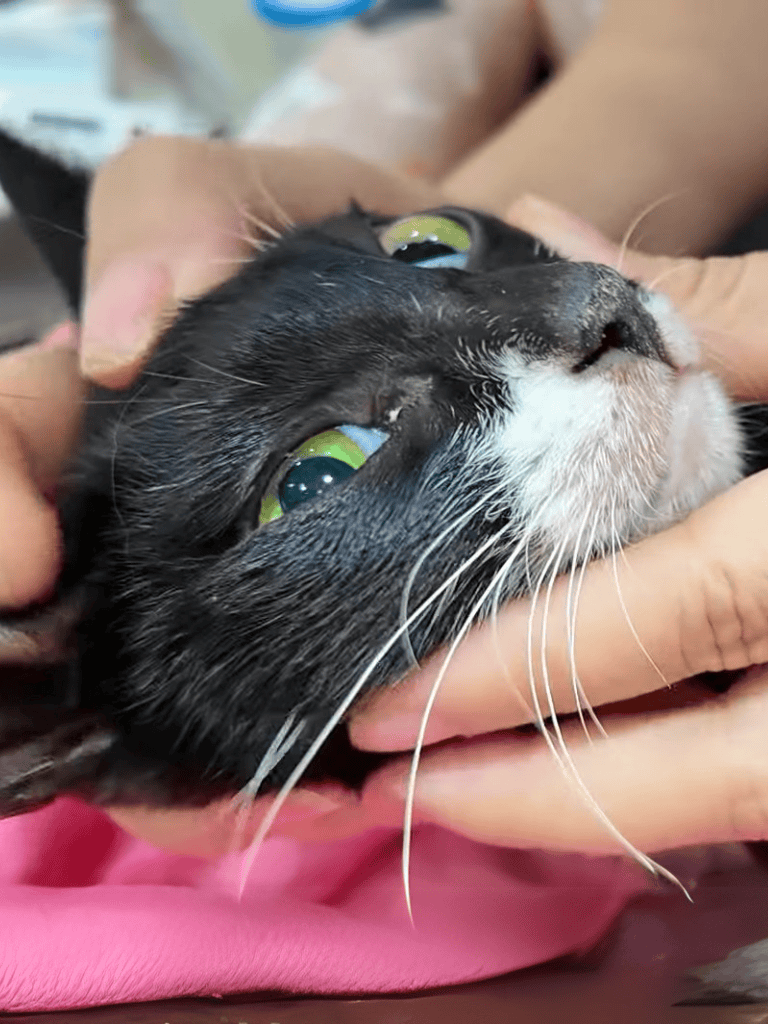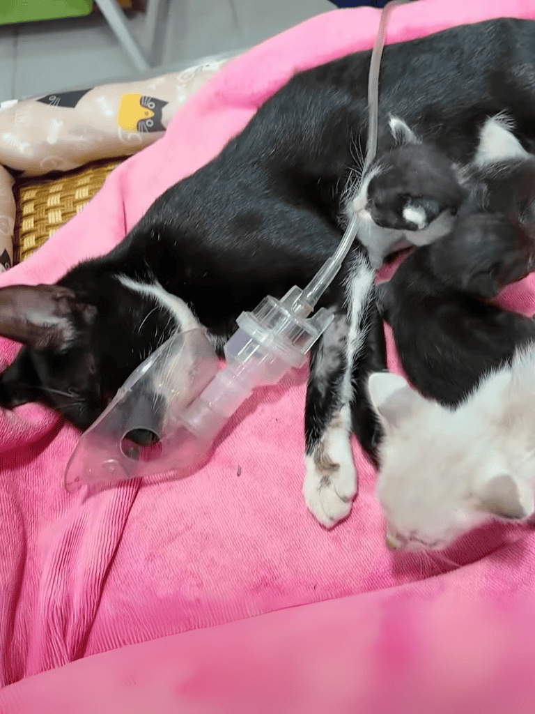 The mother cat’s condition required monitoring. Poisoning lingered despite treatment. Medicine and oxygen therapy steadied her, but recovery was uncertain.