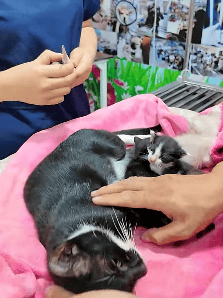 The vet noted the mother cat’s low body temperature and explained oxygen therapy was needed to stabilize her condition. The kittens appeared lively, but the mother’s ordeal continued.