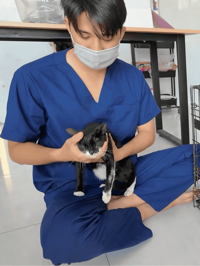 A stray mother cat, weak and unconscious, lay with her kittens in a roadside burrow. We lifted her onto a towel to assess her frail condition. Showing signs of poisoning, we stabilized her heartbeat and gave medicine. Her kittens, huddled beside her, seemed to give her a reason to fight despite the uncertainty of recovery.