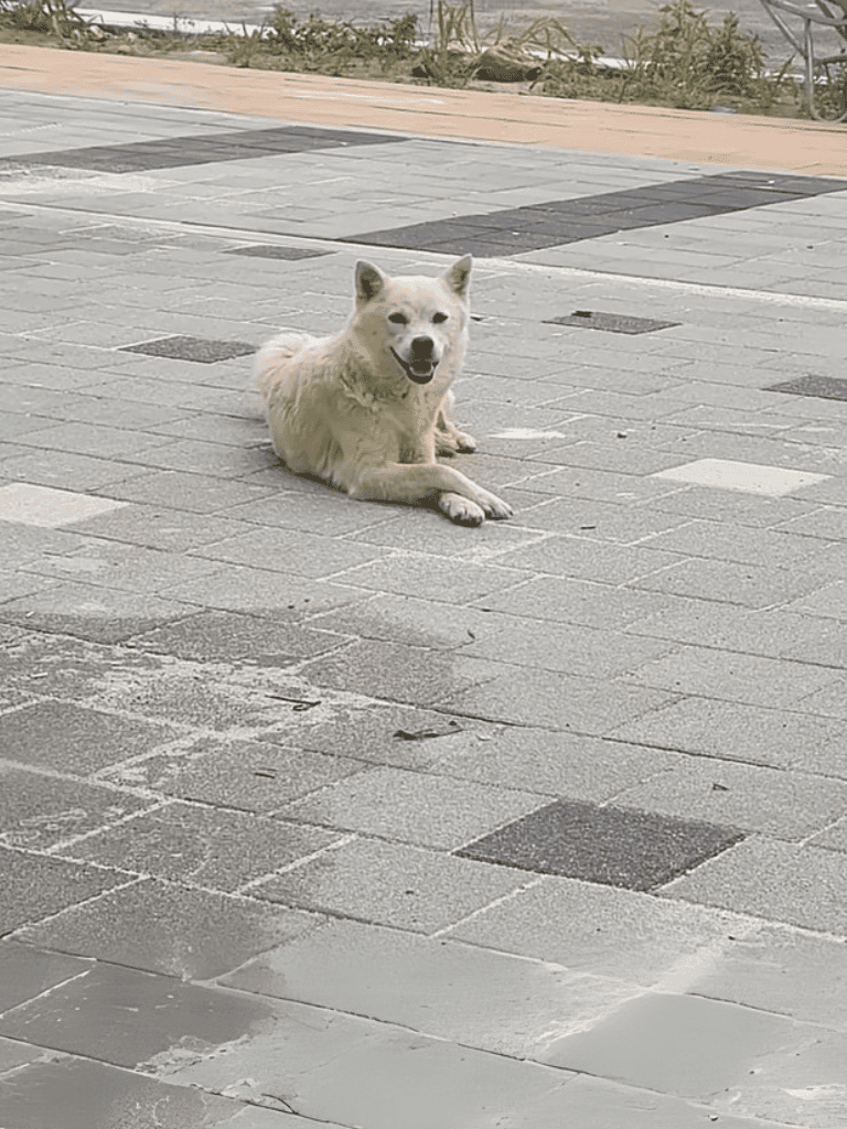 Amid the bustling marketplace, a weary dog knelt at the entrance of a store, her eyes pleading for food.