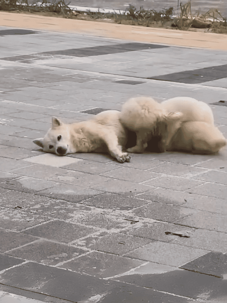 After eating, she rose and padded away with a puppy trailing behind. They vanished into the street, hinting at a deeper story of survival and maternal devotion.