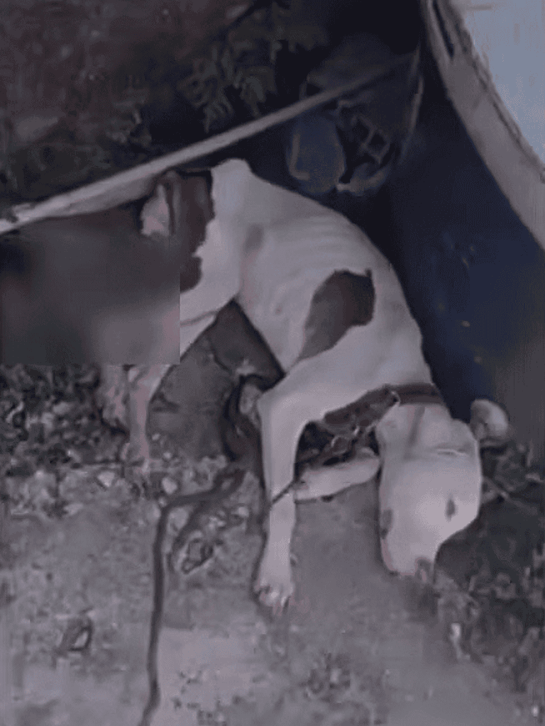 The dog lay motionless, ribs protruding under her frail frame. Her body was parched, tongue dry, and a rope hung loosely around her neck.