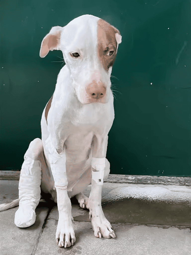 The gash on the dog’s leg exposed bone, surrounded by an infected, oozing wound against her frail frame.