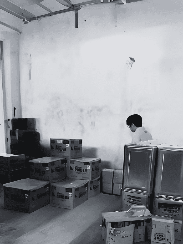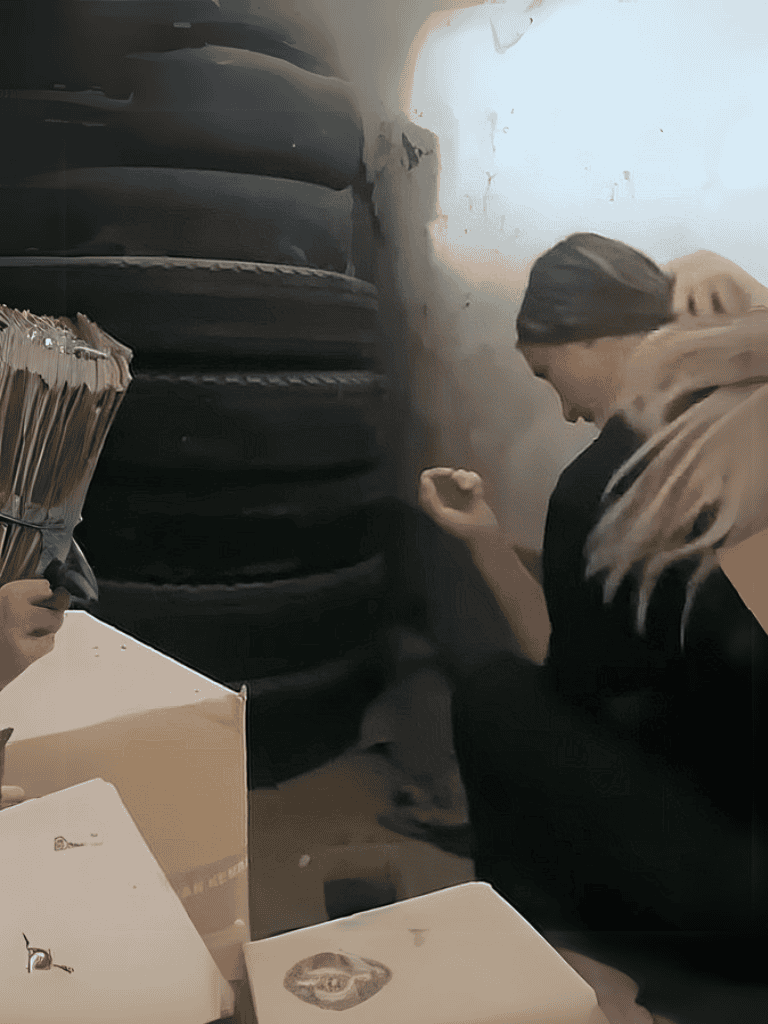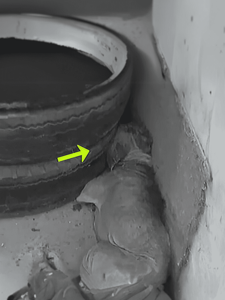 After a call from a worker, I followed the trail of blood through the warehouse. It led me to a corner where I found her hiding behind a tire, trembling in fear.