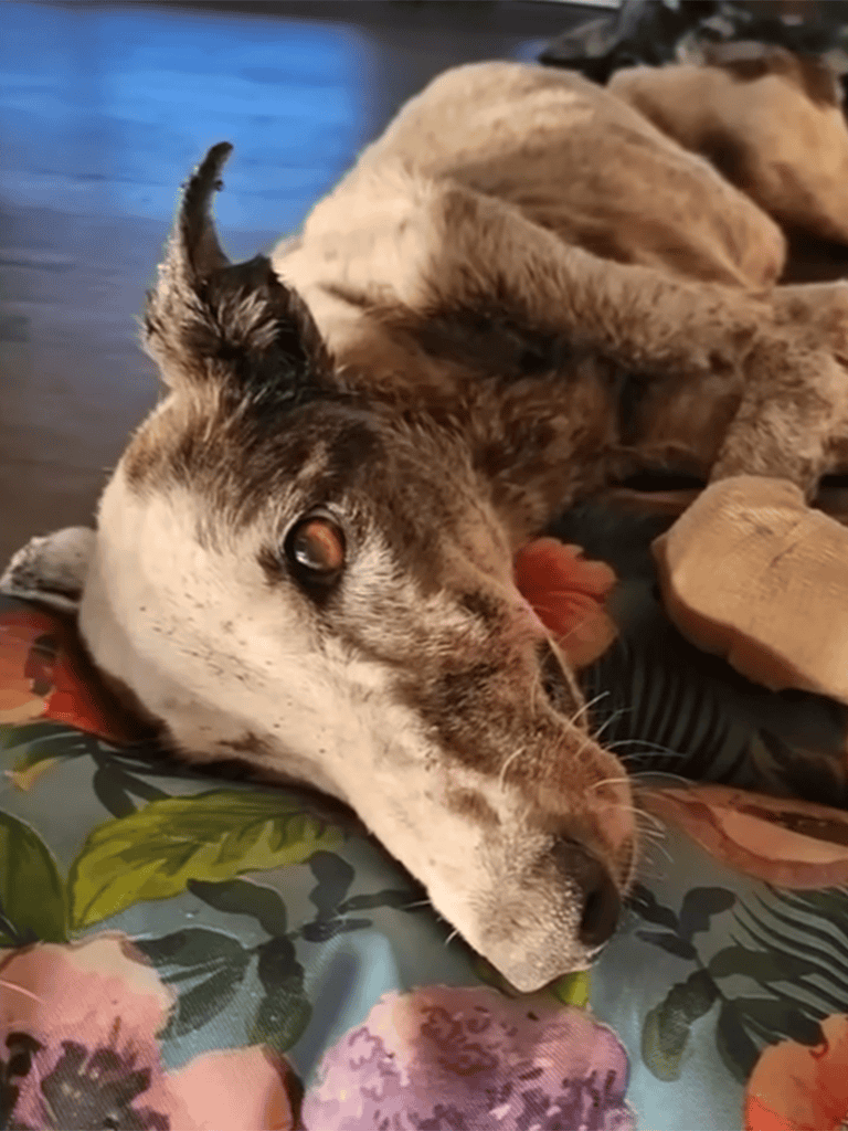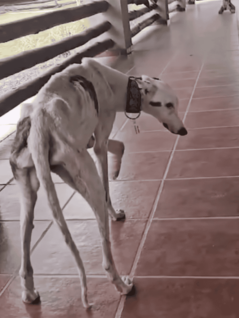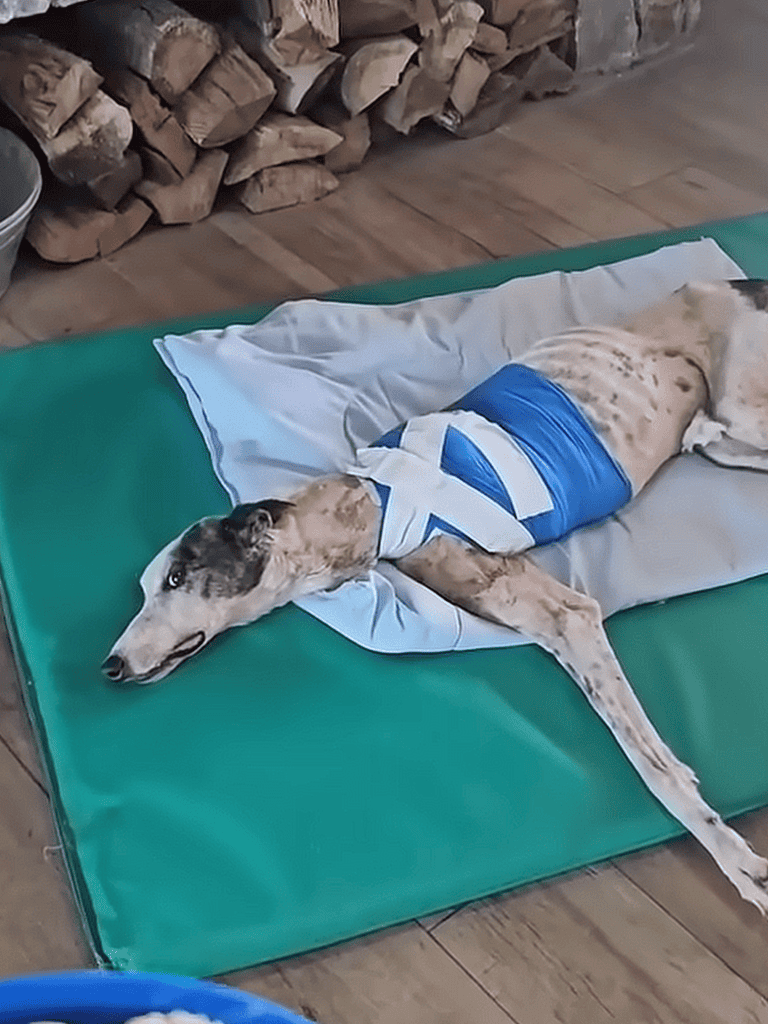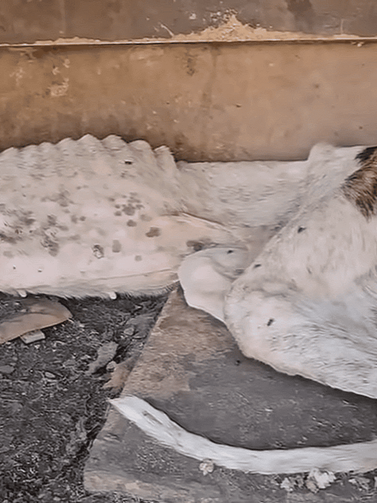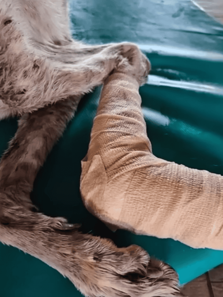 Her frail body lay motionless on the ground, her front leg wrapped in a dirt-streaked cloth. Lifting her head seemed beyond her, her strength drained by neglect.