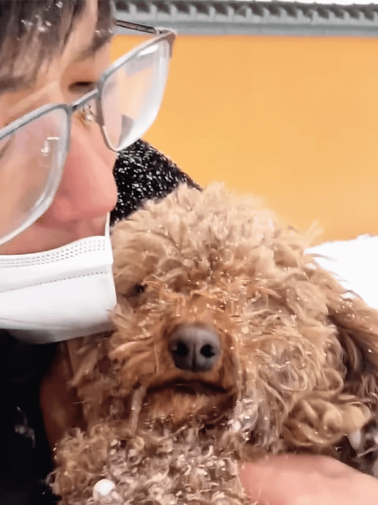 I used a smaller hair dryer to carefully dry the timid dog’s fur. Her eyes watched as I worked gently, the soft hum keeping her calm. She stood still as I dried her, her fur fluffing up and her demeanor relaxing.